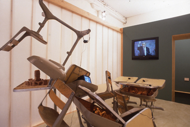At the back at the chalk board, you had the ability to climb inside the crib. The inside was chaos (fig 8). It took the shape of a schoolroom, its desks in disarray. Presiding at the front was Pete Wilson talking out of sync and all the legislators applauding out of synch. It was a kind of slow motion, so you got a weird experience of him at the head of the classroom, visually dominating as the teacher would, but his voice was coming from outside. It did not quite connect with the image.